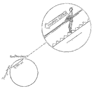 An eyepiece provides an inner-view perspective of the far-side surface of Earth. Swiveling in two axes allows the device to point to all parts of the globe with graphics and text superimposed — great circle path to the distant location, meridians & parallels, distances, and dynamic text describing the field of view.